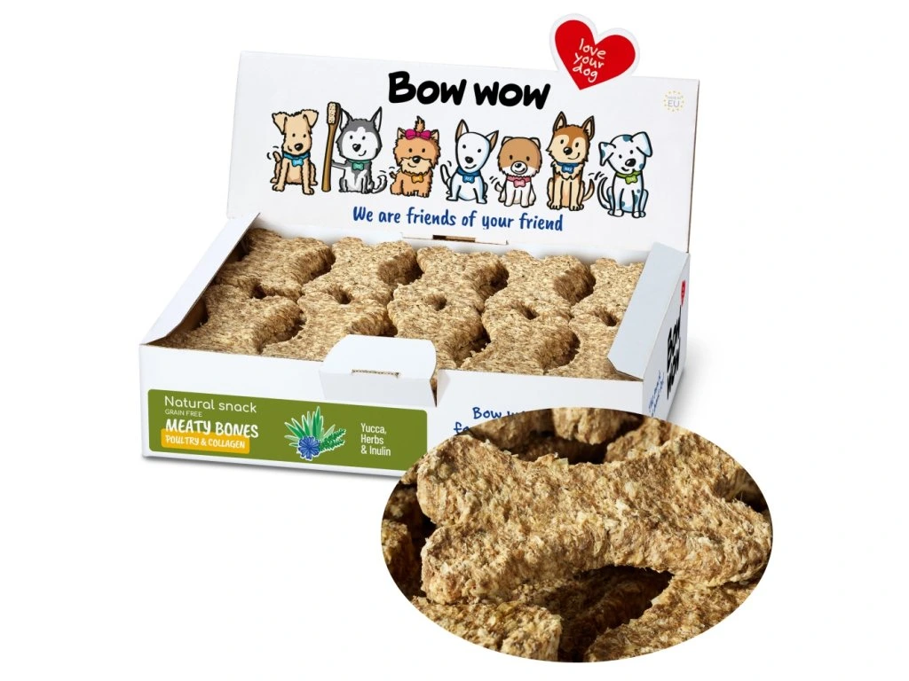 Tratament pentru câini fără gluten în formă de os cu carne de pasăre, colagen și yucca, ierburi și inulină.