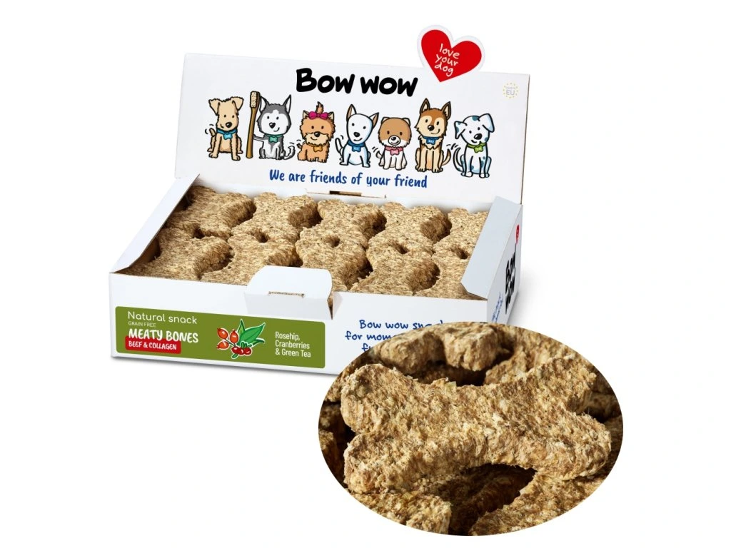 Tratament natural pentru câini în formă de os cu carne de vită, colagen, măceș și merișor.
