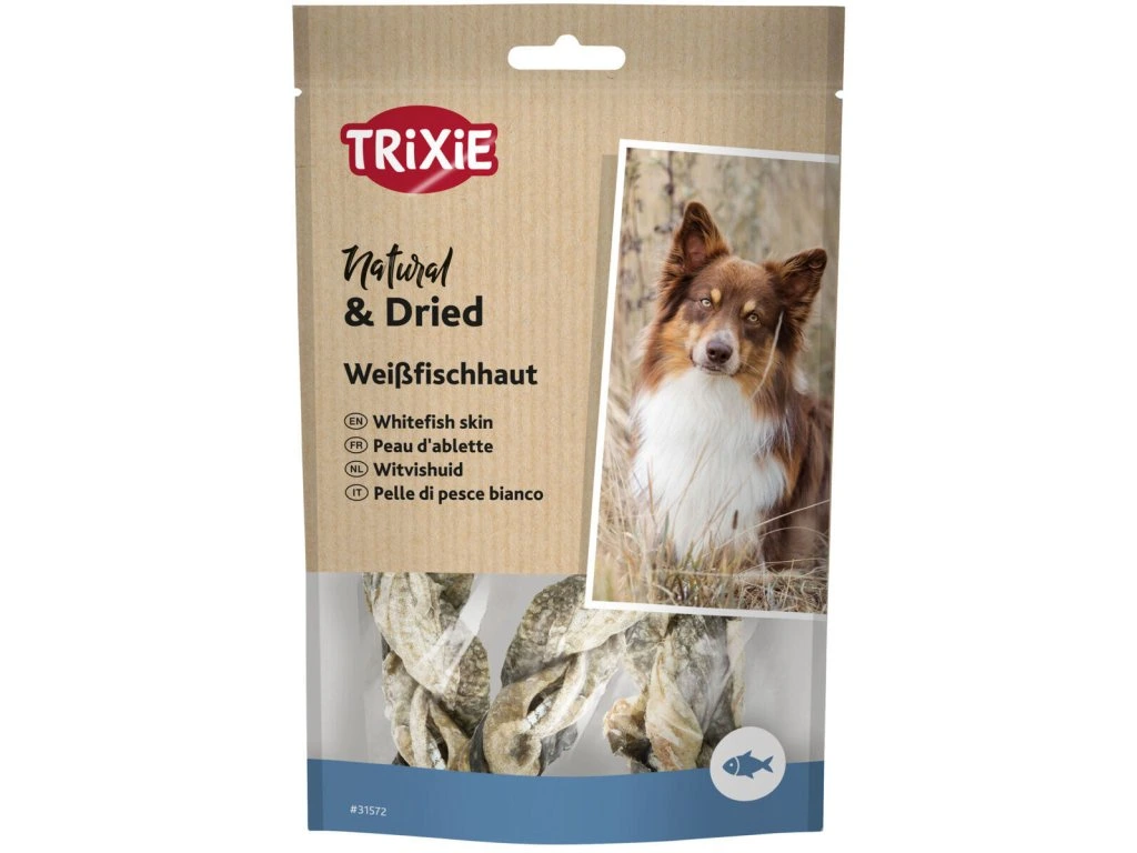 - greutate > Ingrediente: 100% piele uscată de pește alb (0,15% acizi grași omega-3 și 0,1% acizi grași omega-6)