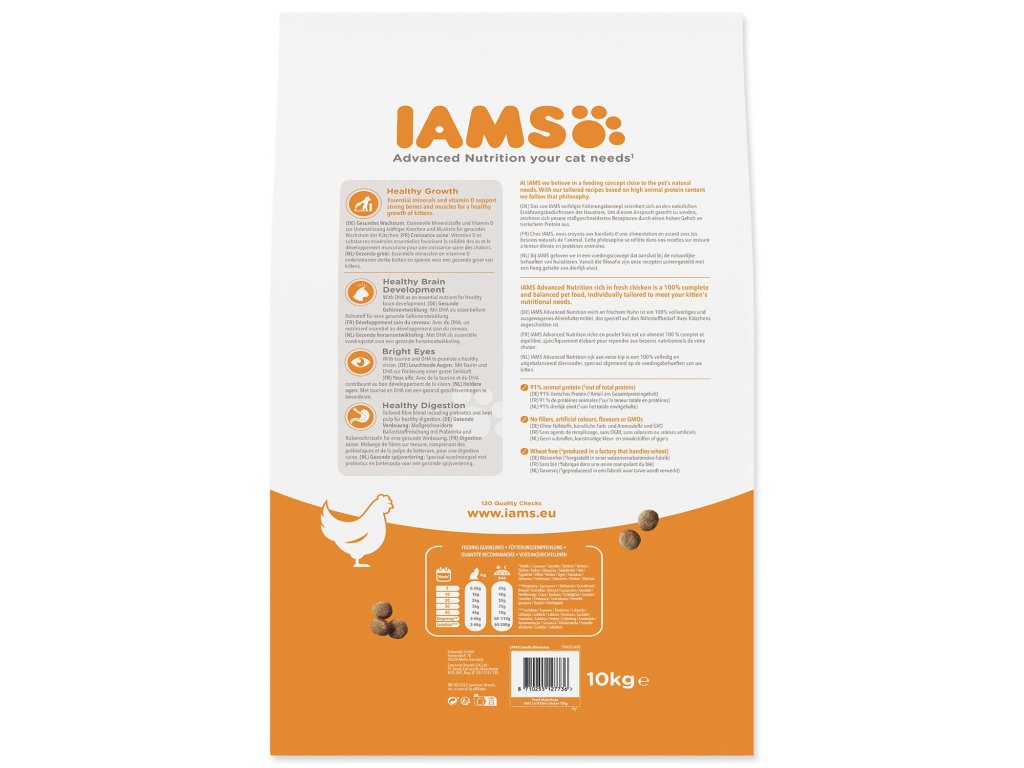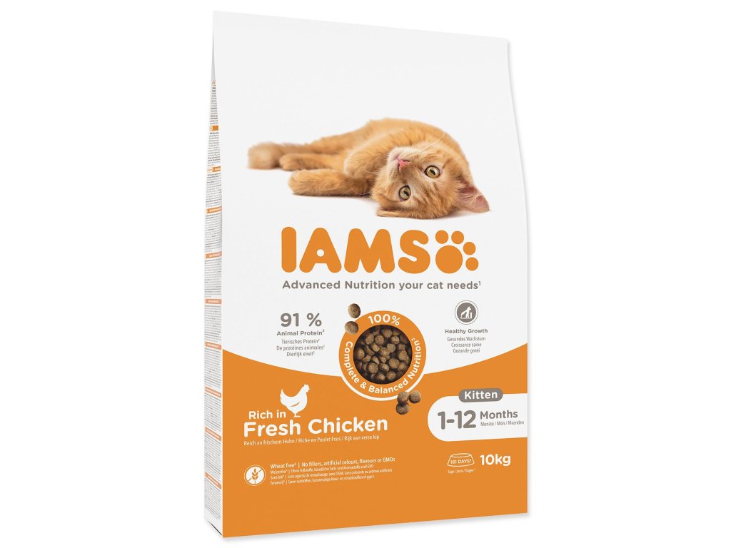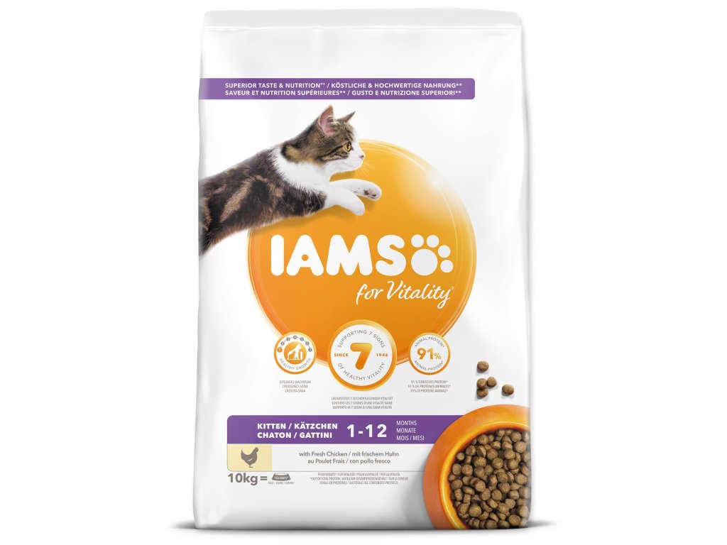 IAMS for Vitality pentru pisoi este o hrană 100% completă și echilibrată, cu o formulă expertă, de care animalul tău va iubi și de care va beneficia. Formula noastră nouă și îmbunătățită pentru pisoi cu pui proaspăt se bazează pe proteine animale de înaltă calitate selectate cu atenție pentru a susține șapte semne de vitalitate sănătoasă a pisoiului. Pentru a menține pisoii sănătoși, activi și plini de energie, rețetele noastre delicioase conțin până la 91% proteine animale (din proteinele totale).
