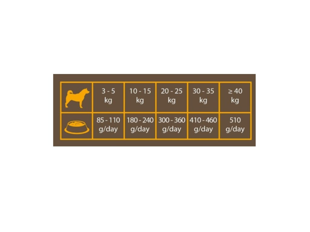 Mod de administrare: Schimbarea furajului trebuie făcută treptat pe o perioadă de 7 zile. Hrăniți rația zilnică de alimente, de preferință împărțită în 2 până la 3 porții pe zi, întotdeauna la aceeași oră. Rația de hrănire poate varia în funcție de activitate, rasa de câine și condițiile de mediu. Câinele trebuie să aibă întotdeauna la dispoziție apă curată și proaspătă.