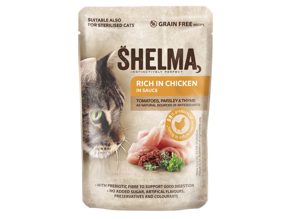SHELMA Cat kuřecí s rajčaty a bylinkami v omáčce, kapsa 85 g