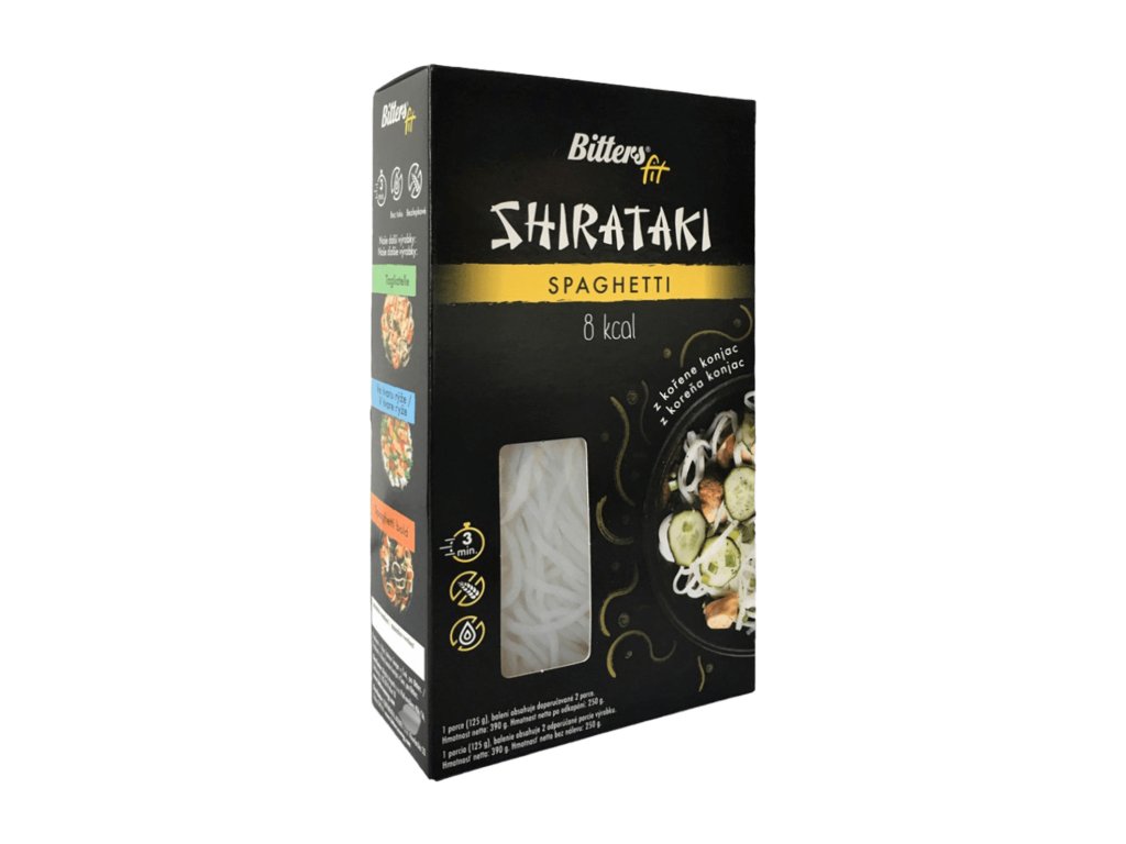 těstoviny Bitters Shirataki Spaghetti Slim 390 g Bitters Shirataki konjakové špagety nemají skoro vůbec žádné kalorie, neobsahují tuky, cukry, bílkoviny ani lepek. Vláknina, která se vyskytuje ve výrobku, obsahuje stopové množství sacharidů v podobě glukomannanu, který je pro lidský organizmus téměř nestravitelný. Pouze nepatrné množství je tráveno v tenkém střevě a proto energetická hodnota těstovin shirataki je pouhých 8 kcal/100 g. Shirataki FIT je namočeno v tekutině s charekteristickou vůni, která se zcela vytratí při oplachování tekoucí studenou vodou a není vůbec cítit v chystaném pokrmu. Shirataki FIT nemá žádnou chuť ani pach - vůni i aróma přejímá z omáčky, polévky nebo jiných složek pokrmu, se kterým jsou smíchány.Nutriční hodnoty