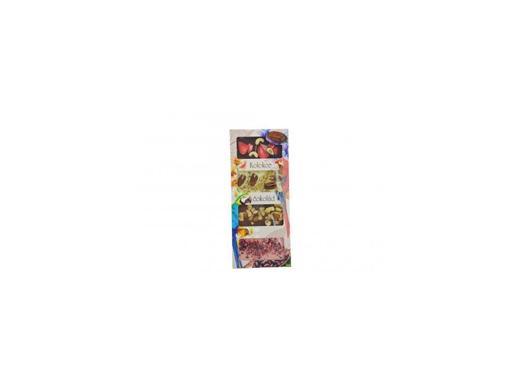 Tabuľky z horkej, mliečnej, bielej a jahodovej čokolády zdobené lieskovými orechmi, kešu, pistáciami, mandľami, brusnicami, pekanom, lyofilizovanými malinami.Nutričné hodnotyttr d>Tuky33,80 g z toho nasýtené mastné kyseliny 17,80 g Sacharidy 49,90 g cukry46,70g Vláknina Bielkoviny 6,00g Soľ