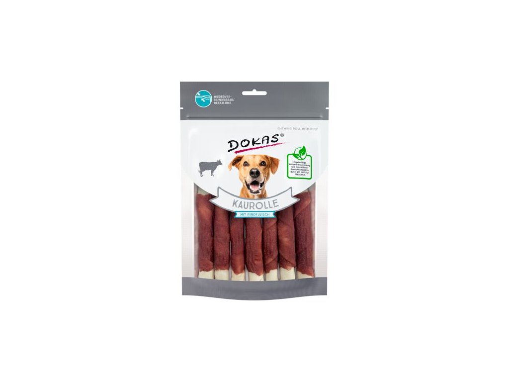 Tyčinky z hovädzej kože sú potiahnuté hovädzím mäsom a slúžia ako chutná a zdravá maškrta pre psov na žuvanie. To pomáha udržiavať zdravé zuby a ďasná a predchádza vzniku zubného povlaku a kameňa. Vysoká kvalita použitých surovín zaručuje ich výraznú chuť a vôňu. Rovnako ako všetky maškrty Dokas, aj táto pochúťka je bez konzervantov, umelých farbív, dochucovadiel a glycerínu. Zloženie: hovädzie mäso 57%, hovädzia koža 33%, vedľajšie rastlinné produkty, minerálne látky Analýza: hrubé bielkoviny 73,8%, hrubé oleje a tuky 4,8%, hrubé popoloviny 2,7%, hrubá vláknina 0,5%, vlhkosť 14% Podávajte ako odmenu. Zaistite dostatok pitnej vody. Po otvorení starostlivo uzavrite zipsom a skladujte v suchu a chlade. Balenie obsahuje kyslíkový absorbér na uchovanie kvality výrobku. Maškrty sú v dnešnej dobe neoddeliteľnou súčasťou kŕmenia maznáčikov, a tak aj u nich je potrebné dbať nielen na chuť, ale aj na zdravé zloženie. Pri maškrtách Dokas máte istotu, že všetky použité suroviny spĺňajú prísne kritériá a sú počas výroby pravidelne preverované. Psie a mačacie maškrty Dokas podliehajú pravidelným kontrolám kvality svetovo uznávaným nemeckým inštitútom SGS Institut Fresenius. Toto nezávislé laboratórium patrí medzi popredné európske spoločnosti testujúce kvalitu potravín.Dodatočné parametre