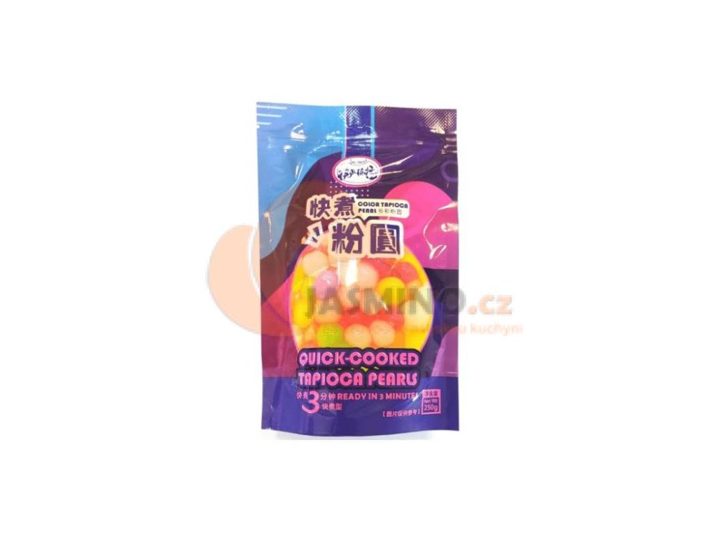 Zloženie: Kukuričný škrob (35%), voda, zahusťovadlo (E1442, E1420), farbivo (E150d sulfitový amoniakkaramel), zahusťovadlo (E412), sladidlo (E951), konzervačná látka (E262 (ii)), aróma. Nutričné hodnoty na 100g : Energia 920kJ / 220 kcal / Tuk 0g z toho nasýtené mastné kyseliny 0g / Sacharidy 54g z toho cukor 0g / Proteín 0g / Soľ 0,15g. Pokyny: Varte 10 šálok vody na každú 1 šálku perál tapioky vo veľkom hrnci. Tapioku pomaly pridajte do vriaceho hrnca a zľahka premiešajte. Počkajte, až tapioka vypláva na vodnú hladinu. Krycí hrniec. Varte na strednom ohni po dobu 2-3 minút. Vypnite teplo a varte ďalšie 2-3 minúty (upravte čas tak, aby tapioka zmäkčila podľa osobného vkusu). Vydlabajte tapioku a nechajte ju 20 sekúnd odpočívať v studenej vode. Vydlabajte tapioku do suchej misky a vmiešajte do nej cukor alebo med. #Str10Tipy na servírovanie: Pripravené nové ságo je vynikajúce studené alebo horúce. Pridajte do nápojov, ako je mliečny čaj alebo káva, alebo do dezertov. Tapioku prosím zjedzte do 4 hodín po uvarení. Po otvorení obalu nevyužitú časť chráňte a čo najskôr spotrebujte. Varovanie: Nesmú konzumovať deti do 3 rokov. Deti a starší ľudia by mali konzumovať pod dohľadom dospelých. Pri konzumácii horúcich nápojov buďte opatrní a vyvarujte sa udusenia tapiokou. Povrch bieleho prášku na perličkách tapioky je škrob. Veľké rozdiely teplôt pri skladovaní môžu spôsobiť vodnú paru vo vnútri obalu. Oba vzhľady sú normálne a bezpečné na konzumáciu. SKLADOVANIE : Uchovávajte na chladnom a suchom mieste. Chráňte pred priamym slnečným žiarením. Po otvorení chlaďte vo vzduchotesnej nádobe.#Str10KRAJINA PÔVODU: Čína.Dodatočné parametre