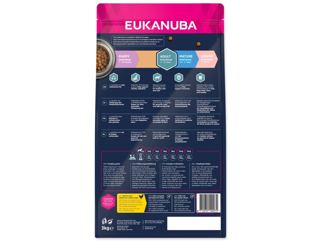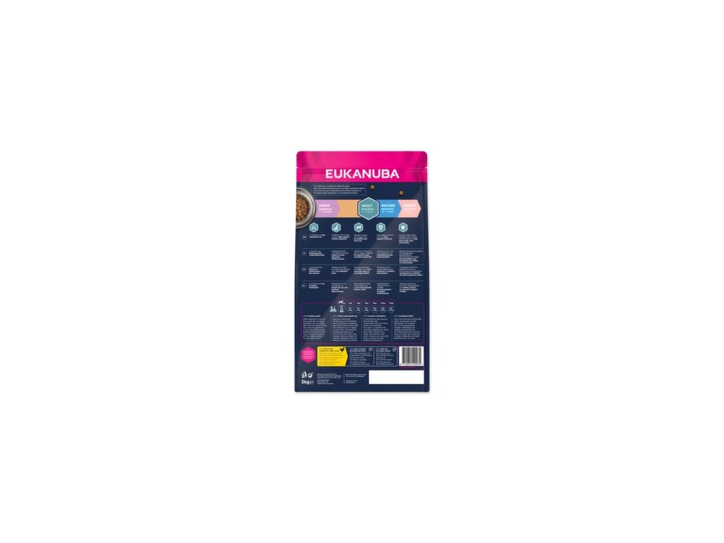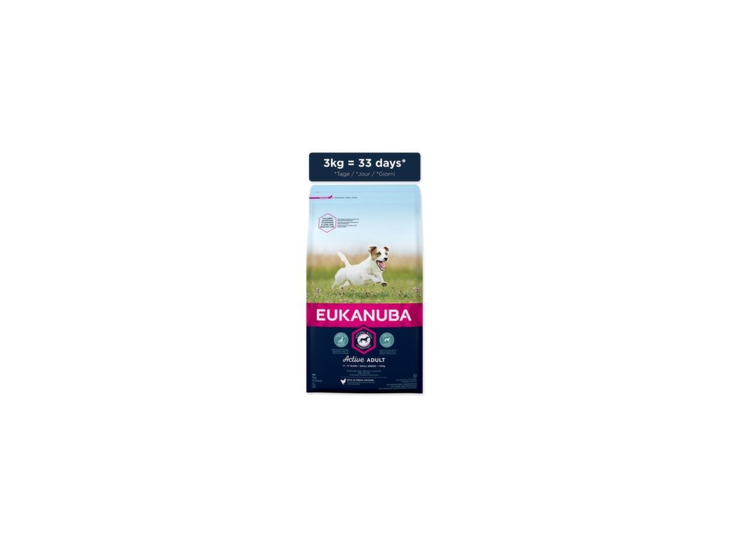 Nová EUKANUBA vylepšená receptúra so zameraním na konkrétnu fázu života - pre malých aktívnych dospelých &&& poskytuje na mieru upravenú výživu na podporu štíhlych svalov a vyvážený príjem energie, ktoré zaistia optimálny telesný stav vášho dospelého psa. Naša jedinečná na mieru upravená receptúra pre malých dospelých psov obsahuje zmes vlákniny, prebiotiká FOS a repnej dužiny pre podporu zdravého zažívania, juku, ktorá pomáha znížiť zápach zo stolice, prirodzený zdroj mastných kyselín omega-6 a omega-3 pre zdravú kožu a srsť, L-karnitín, ktorý pomáha metabo. Naše unikátne granule v tvare šesťuholníka s prídavkom DentaDefense taktiež pomáhajú s udržiavaním čistých a zdravých zubov. Pokročilá výživa pre malých dospelých psov so zameraním na podporu optimálneho telesného stavu a celoživotnú pohodu. ;">Napomáha dentálnej hygiene Špeciálne pokrytie granúl pomáha redukovať tvorbu zubného kameňa. Pre psy s citlivým zažívaním Podporuje zdravý tráviaci trakt, zdravá čreva a výborné vstrebávanie živín. Obsahuje exkluzívne zloženie fermentovanej vlákniny (repnú dreň + FOS). Výživové zložky napomáhajú k udržaniu obvyklých hodnôt krvného cukru po jedle. Podporuje imunitný systém a každodennú prirodzenú regeneráciu zdravých buniek. Obsahuje dôležité antioxidanty, ako je napríklad vitamín E. Podpora zdravej kože a srsti