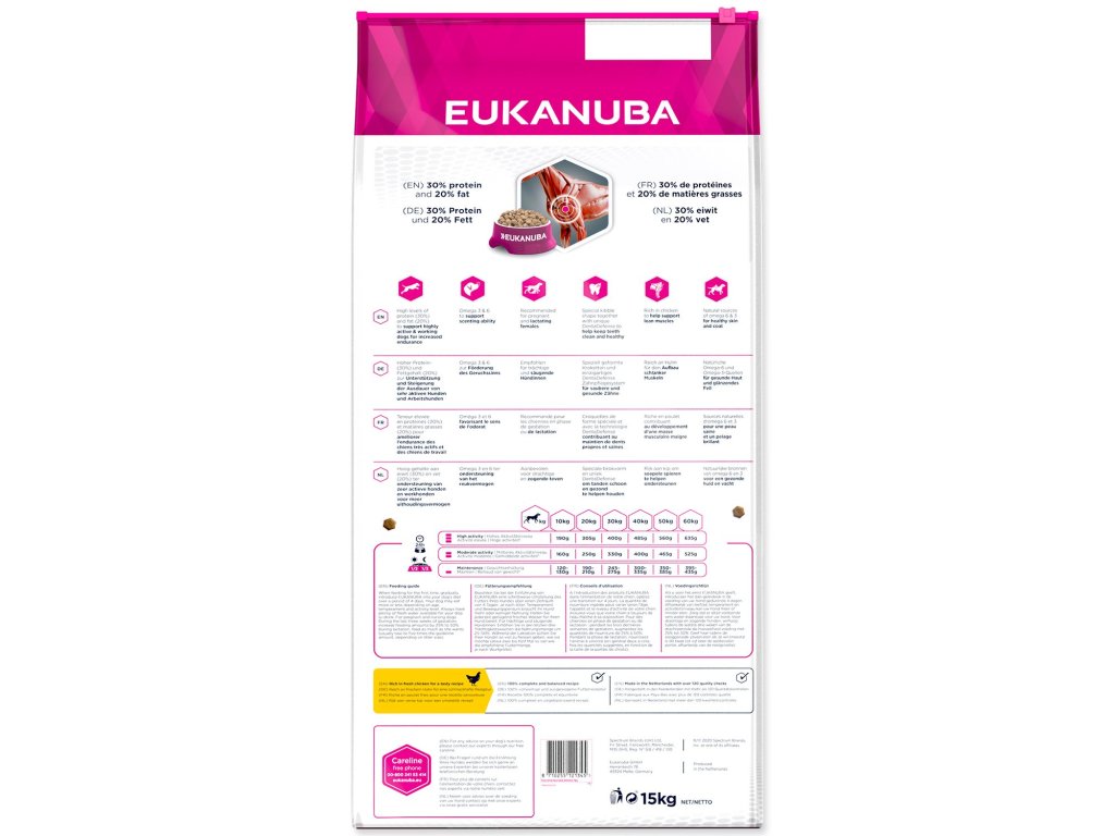 Krmivo je zostavené tak, aby poskytovalo rovnomerné množstvo energie a živín pre špičkový výkon. Psi, ktorí majú veľa pohybu vďaka pracovným a poľovníckym skúškam, potrebujú viac ako každodennú stravu, aby si udržali dobré zdravie a mohli podávať vrcholové výkony. To isté platí pre gravidné a dojčiace suky a pre psov s podváhou.