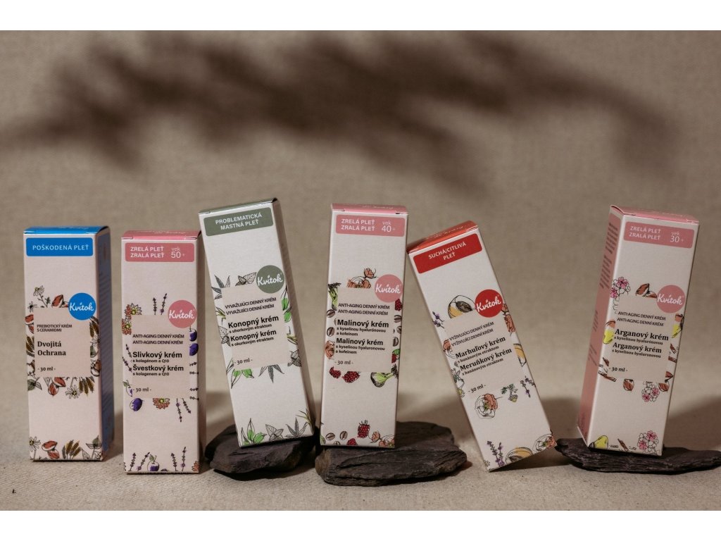 Aby pokožka zostala krásna a svieža aj po päťdesiatke je sen každej ženy. Na to, aby sa sen stal skutočnosťou, treba zdravo žiť, tráviť čas na čerstvému vzduchu, dostatočne spať a hlavne sa veľmi smiať. Pokiaľ už predchádzajúce body spĺňate, tak je na rade voľba vhodného prípravku, ktorý vám so starostlivosťou o pokožku pomôže. V Kvitku namiešali tento báječný slivkový krém, ktorý je bohatý na antioxidanty, rastlinný kolagén a koenzým Q10.. Opäť v 100% prírodnej kvalite as vysokým obsahom zložiek v BIO kvalite.Dodatočné parametre