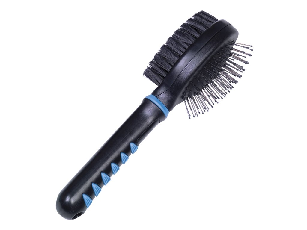 Obojstranná univerzálna kefa Nobby z kolekcie Comfort Line. Kefa z jednej strany oceľové hroty s plastovými krytkami az druhej strany s nylonovými štetinami, je vhodná pre všetkých psov a mačky. Oceľové hroty s plastovou ochranou masírujú pokožku a podporujú krvný obeh zvieraťa. Nylónové štetinky zaisťujú finálnu úpravu srsti, čistia a leští. Plastová rukoväť je v ruke bezpečná a pohodlná a zaisťuje pohodlné čistenie.Dodatočné parametre
