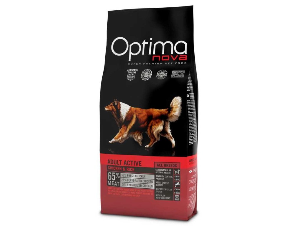 OPTIMAnova Dog Adult Active zložené z kvalitných bielkovín a ľahko stráviteľných sacharidov v kombinácii s prospešnými tukmi. Krmivo obohatené o vitamíny, minerálne látky a antioxidanty. znižuje riziko vzniku intolerancií a potravinových alergií.