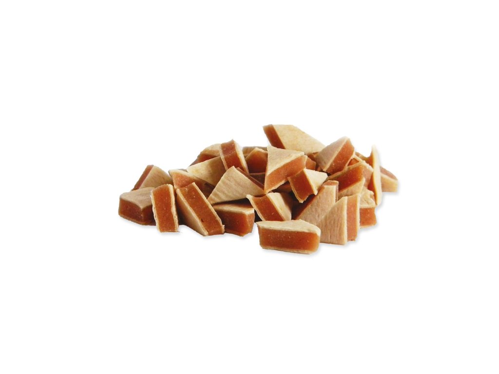 Vynikajúci, mäkký sandwich z kuracieho mäsa a tresky polak s vysokou chutnosťou, ideálny ako odmena. Zloženie: kuracie prsia 51,5 kovina 7,9%, pšeničná múka 5,9%, zemiakový škrob 1,7%, palmový olej 0,55%, cukor 0,3%, soľ 0,3%, cesnakový prášok 0,3%, obsahuje farbivá povolené EÚ 0,05%. hrubé oleje a tuky 1%, hrubá vláknina 1%, hrubý popol 3%, vlhkosť 30%.