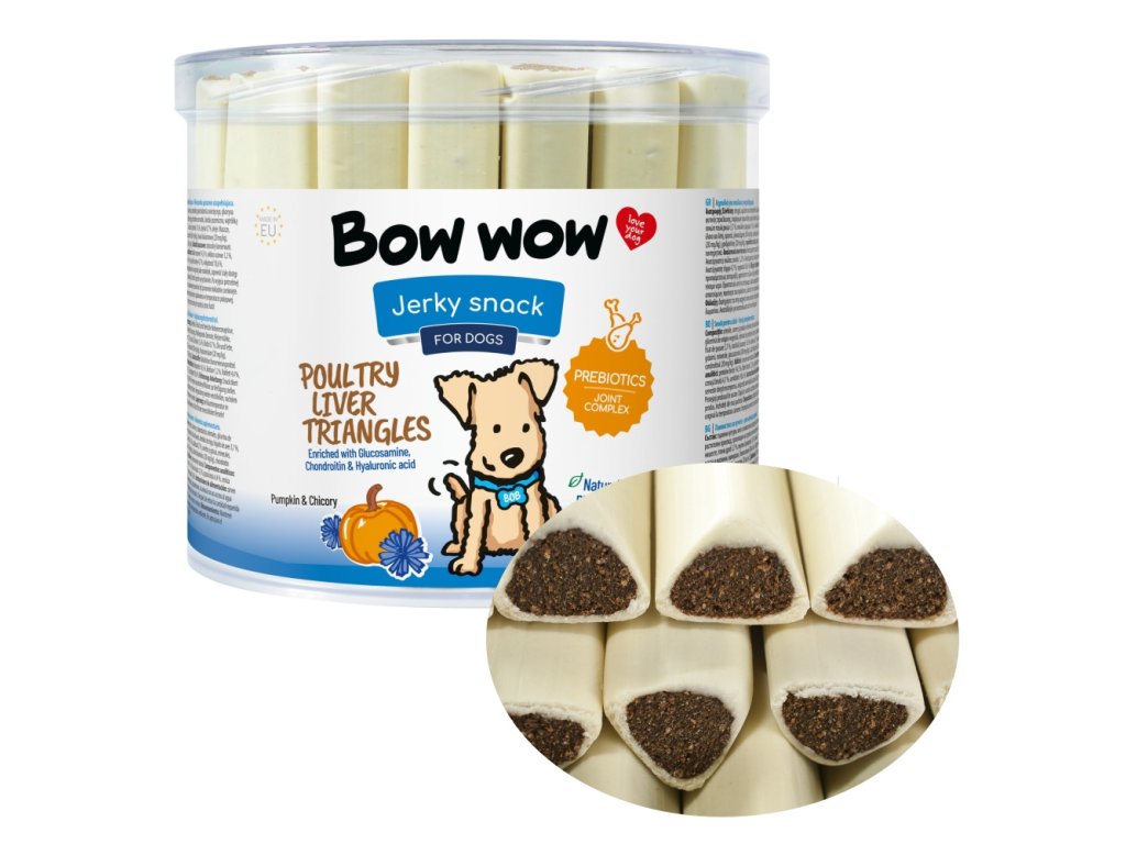Pochúťka pre psov v tvare trojhránkov s kuracou pečeňou.