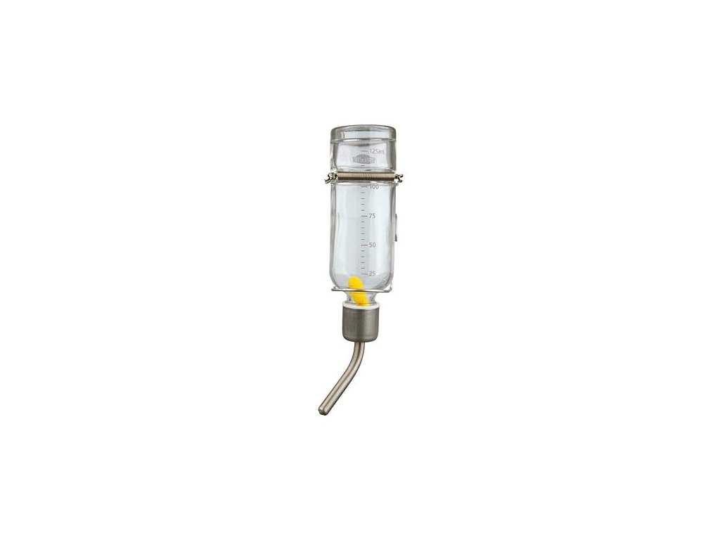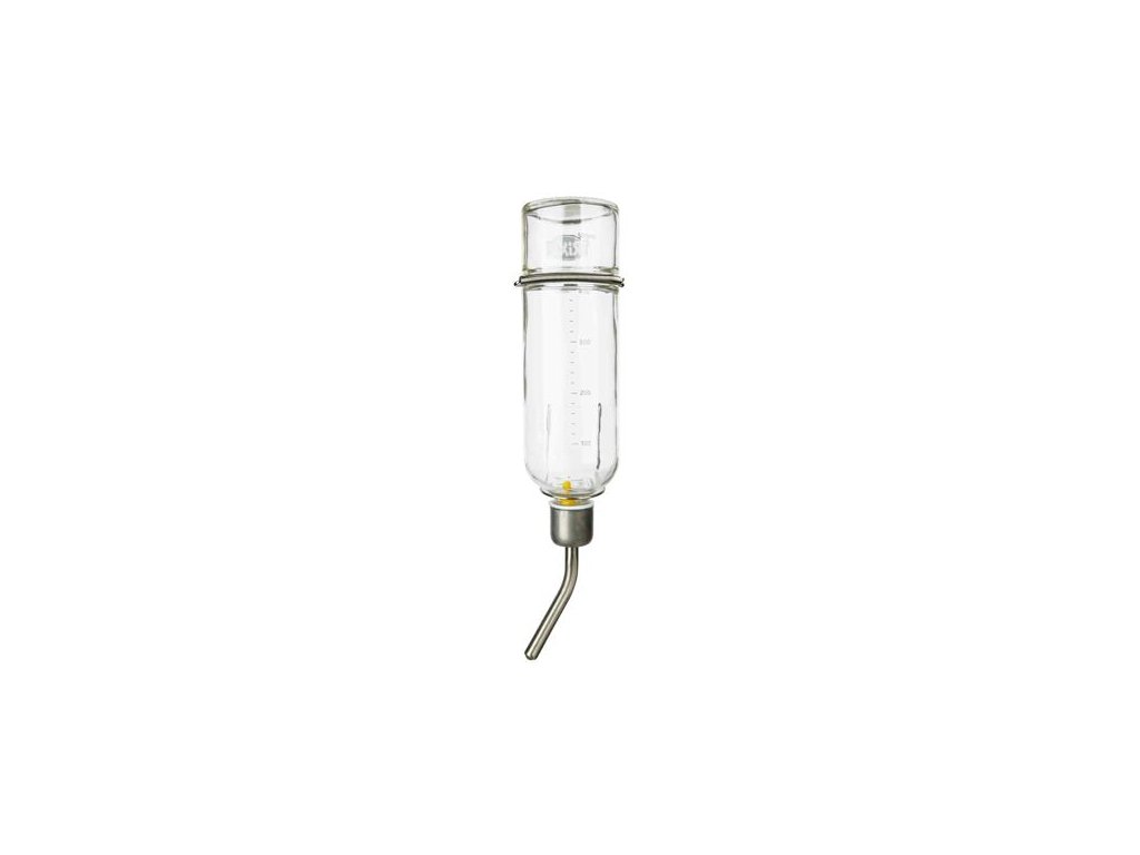 Skleněná napáječka s kovovým pítkem
