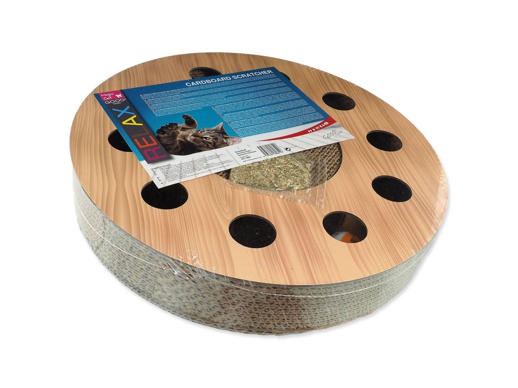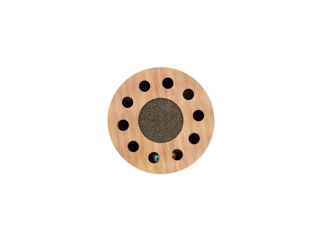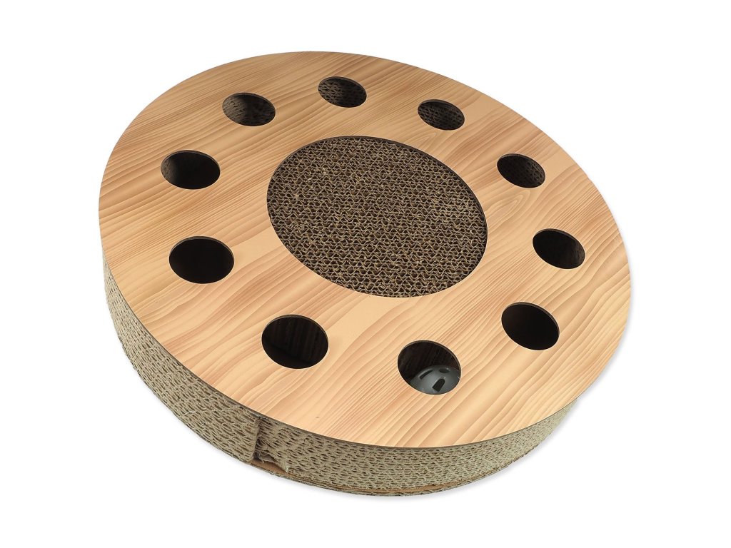 Interaktivní kartonové škrabadlo pro kočky se šantou, barevné provedení ve vzoru dub.