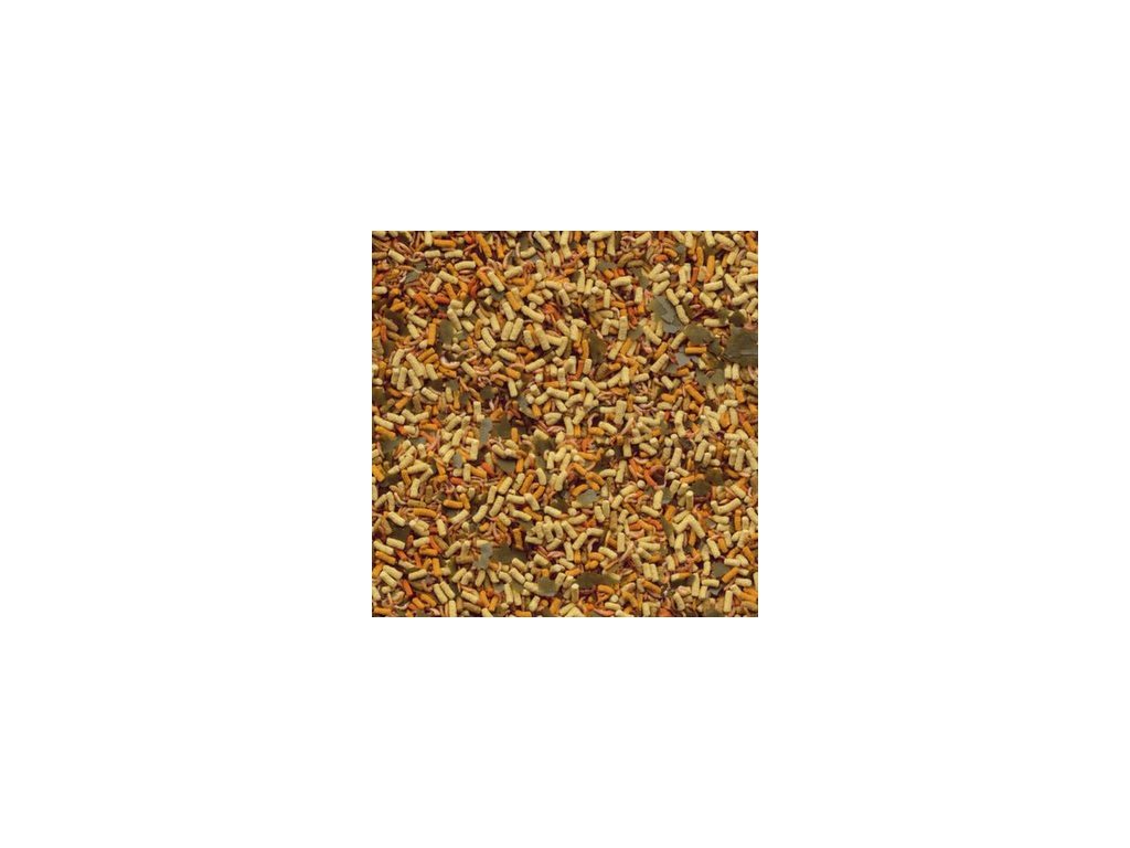 Složení: obilí, rostlinné bílkovinné extrakty, vedlejší produkty rostlinného původu, měkkýši a korýši, (13% gamarus), ryby a vedlejší rybí produkty, řasy (4,2% spirulina maxima), kvasinky, oleje a tuky, minerální látky, cukr, zelenina, lecitin, kyselina citronová.
