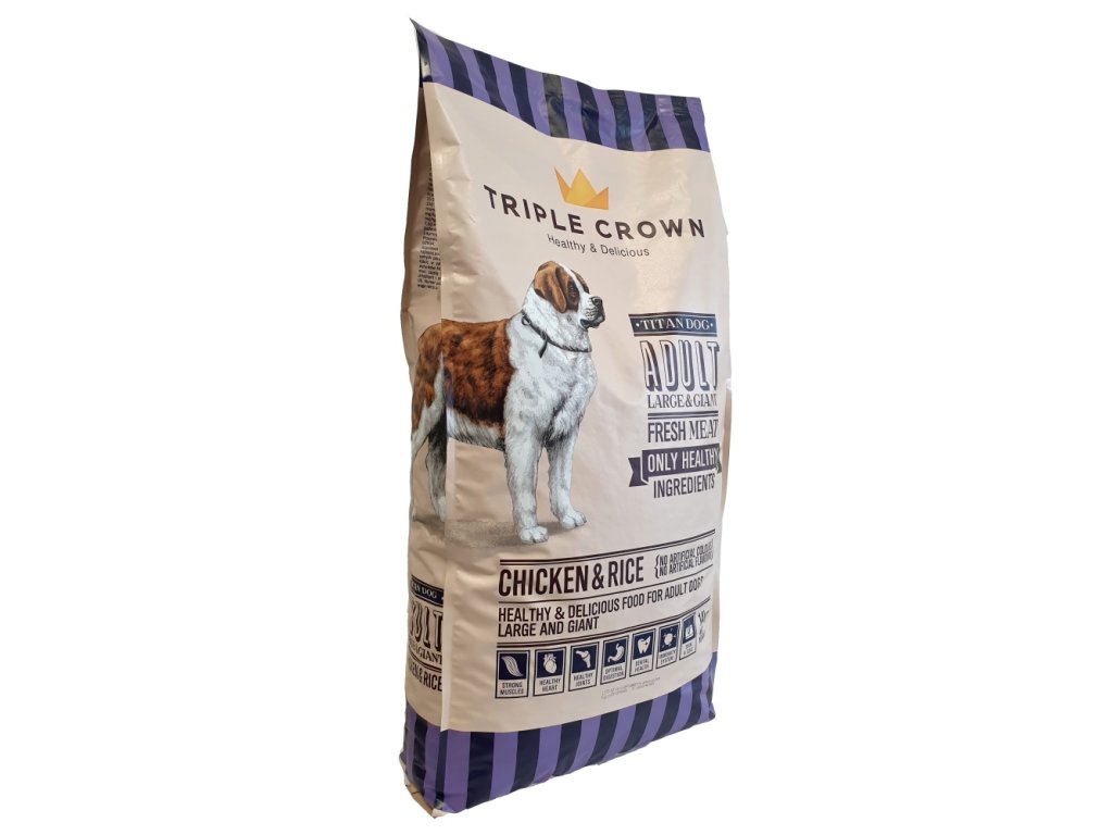 Triple Crown Dog Adult Maxi Titan obsahuje vysoce kvalitní přírodní suroviny. Vysoká hladina bílkovin, správná kombinace vitamínů a minerálů udržuje silné a zdravé kosti . Rýže, jako zdroj vysoce kvalitních sacharidů přispívá ke správnému fungování trávicího systému. Správný podíl vlákniny a kvasinek podporuje správné fungování střev. Obsah vápníku a fosforu pomáhá udržovat čisté a zdravé zuby. Vitamíny a antioxidanty, jako je vitamín E, zinek a selen, pomáhají udržovat imunitní systém v perfektním stavu.