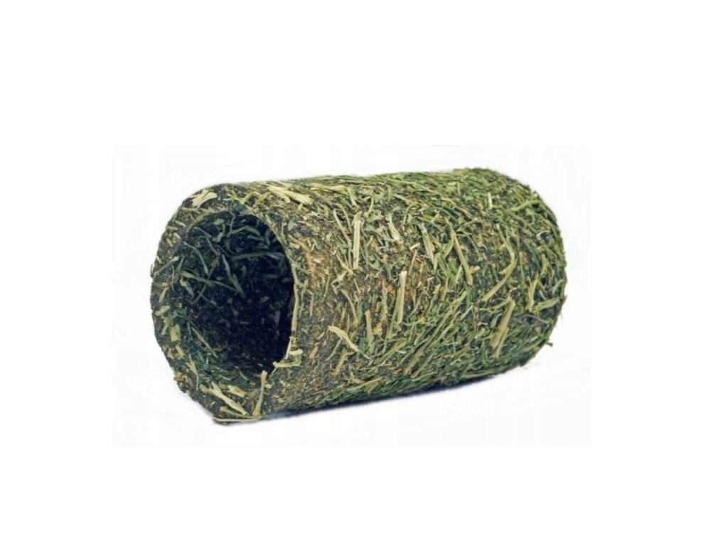 Bylinková pochoutka pro hlodavce ve tvaru dutého tunelu na roli.