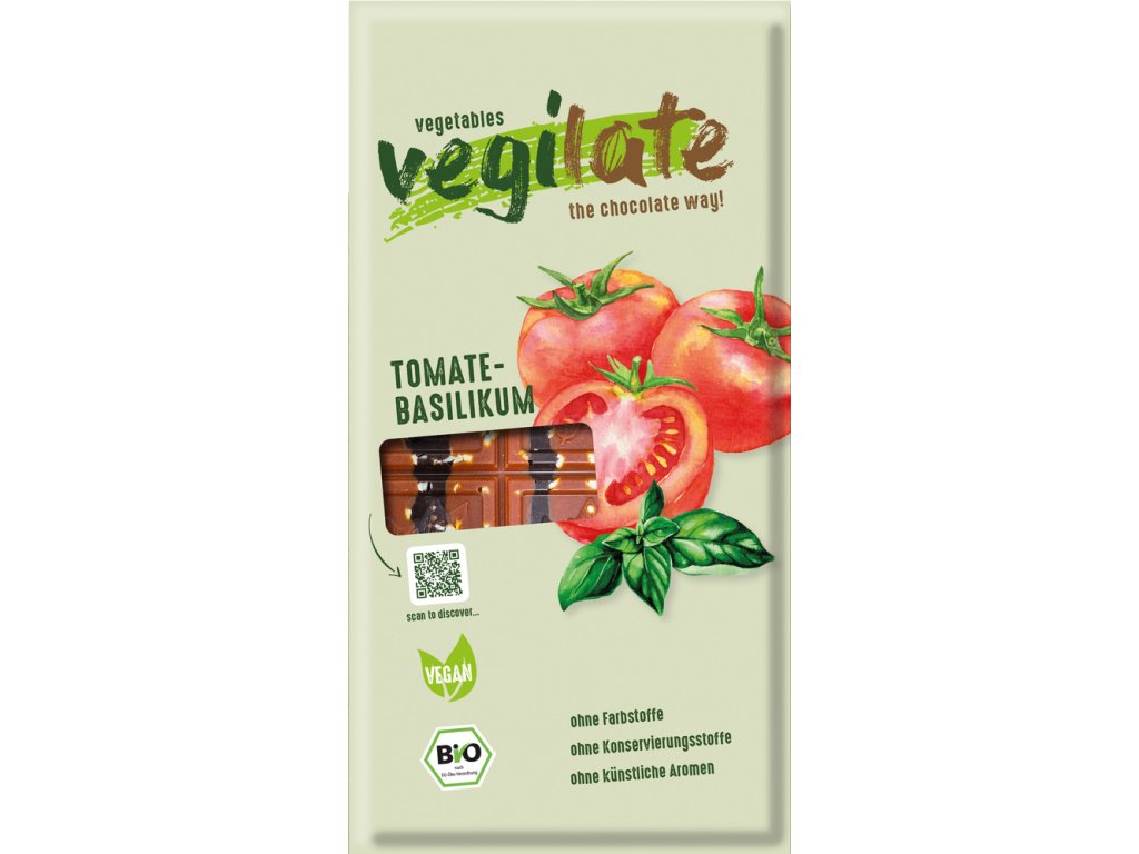 Složení: kakaové máslo*, třtinový cukr*, pražené mandle* 18 %, rajčatový prášek* 16 %, kakaová hmota*, mandlová pasta*, bazalkový prášek* 1 %
