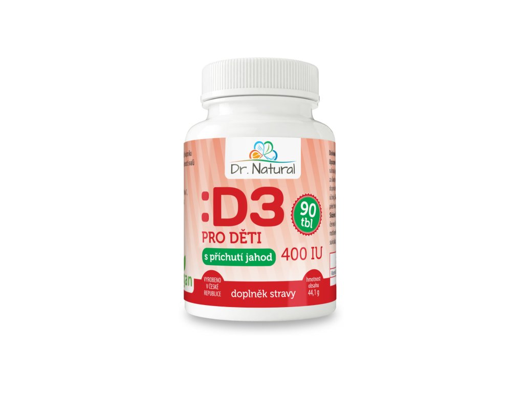 Složení: Skladování: Skladujte při pokojové teplotě do 25 °C. Chránit před mrazem a slunečním zářením. Uchovávat v suchu a temnu. Účinné látky: Vitamín D3 (Cholekalciferol) Obsah v jedné tabletě: 10 μg/400 IU RVH: 200% Pomocné látky: Xylitol, mikrokrystalická celulóza (plnidlo), přírodní barvivo červená řepa, oxid křemičitý (protispékavá látka), stearan hořečnatý rostlinného původu (protispékavá látka), přírodní aroma jahoda, sukralóza, cholekalciferol. Celková hmotnost tablety: 490 mg - vyrobeno z lišejníku - dobře rozpustný v ústech - s příchutí jahod Dávkování: Pro děti od 3 let. 1 x denně 1 tabletu rozpustit v ústech.Nutriční hodnoty