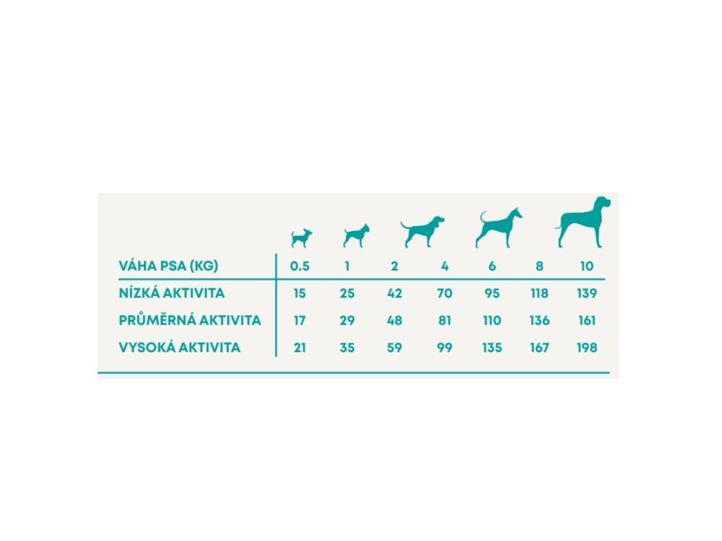 Krmný návod: změnu krmiva je třeba provádět postupně po dobu 7 dní. Jako návod použijte tabulku s dávkováním. Denní množství potravy se může pro každého psa lišit, záleží na úrovni jeho aktivity, plemeni a podmínkách prostředí. Denní krmnou dávku podávejte přednostně rozdělenou na 2 až 3 porce denně, a to vždy ve stejnou dobu. Pes musí mít vždy přístup k čisté, čerstvé vodě. Skladování: skladujte na chladném a suchém místě. Obal by měl být po použití vždy bezpečně uzavřen.