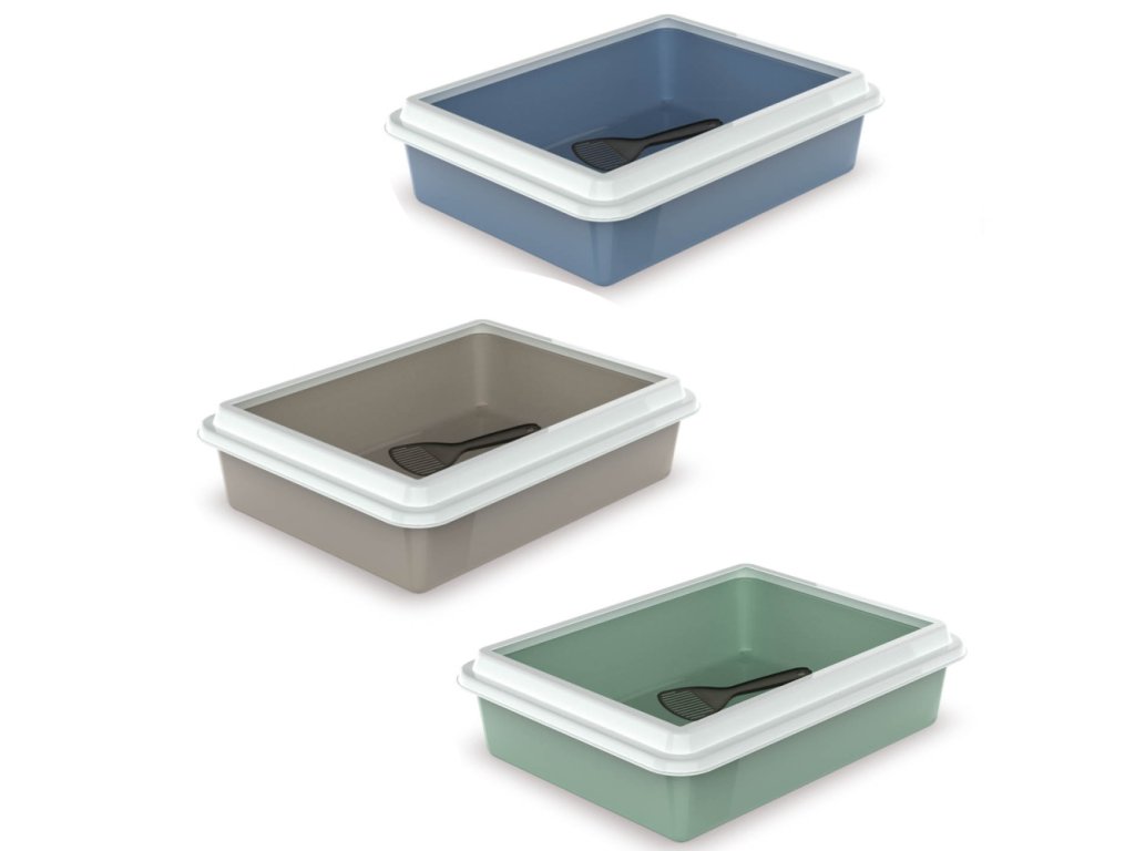 Toaleta pro kočky s okrajem a lopatkou.